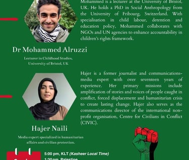 Dr. Mohammed Alruzzi – Lecturer in Childhood Studies at the University of Bristol, UK, who offered an in-depth analysis of how conflict affects children and communities.